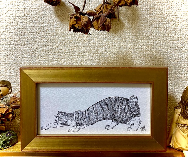 『グググ〜ッて伸びて さぁ今日も沢山寝ようかね』 ✒︎画材:筆ペン ✒︎作品サイズ:60mm×120mm ✒︎額縁サイズ:82mm×140mm ※箱無し ※こちらは置いて飾っていただくタイプです ◆筆ペンでモノクロームの世界を描いています。 ◆線と線がぶつかり交差し弾けながら、無から有へと生まれ変わるキャンバス。 もし、その中の一つ一つに意味があるのなら、百人いれば百通りの意味と思考が存在する様に、 自分の絵にも、見てくれた人の数だけ意味が存在する。 それは、ワクワクだったりドキドキだったり、楽しかったり恐怖や哀しみ、不思議な気持ち、 様々な物語。 そんな六感で感じられる絵を描けるようにと、日々筆を走らせています。 【注意事項】 ※ご覧になっている端末・PC環境など、写真やスキャンで撮影した画像ですので、実際の商品と色味が異なる場合があります。 予めご了承の上ご購入していただけたら幸いです。