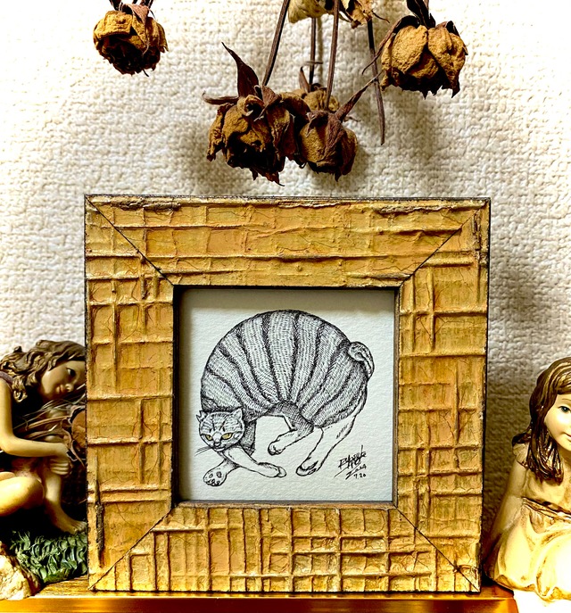 『毎日同じ時間にご飯をもらいに来る子 もらえて当然みたいなお顔が憎めません ご飯後はプイッとそそくさお散歩へでかけます』 ✒︎画材:筆ペン ✒︎作品サイズ:50mm×50mm ✒︎額縁サイズ:105mm×105mm ※箱無し ◆筆ペンでモノクロームの世界を描いています。 ◆線と線がぶつかり交差し弾けながら、無から有へと生まれ変わるキャンバス。 もし、その中の一つ一つに意味があるのなら、百人いれば百通りの意味と思考が存在する様に、 自分の絵にも、見てくれた人の数だけ意味が存在する。 それは、ワクワクだったりドキドキだったり、楽しかったり恐怖や哀しみ、不思議な気持ち、 様々な物語。 そんな六感で感じられる絵を描けるようにと、日々筆を走らせています。 【注意事項】 ※ご覧になっている端末・PC環境など、写真やスキャンで撮影した画像ですので、実際の商品と色味が異なる場合があります。 予めご了承の上ご購入していただけたら幸いです。