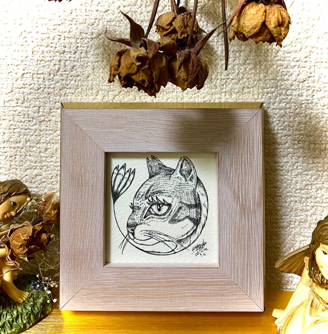 『真面目な表情 真っ直ぐに鋭い眼光 ただ彼は獲物を狙っている訳ではない お花を楽しんでいる ただそれだけなのだ』 ✒︎画材:筆ペン ✒︎作品サイズ:90mm×70mm ✒︎額縁サイズ:115mm×95mm ※箱無し ◆筆ペンでモノクロームの世界を描いています。 ◆線と線がぶつかり交差し弾けながら、無から有へと生まれ変わるキャンバス。 もし、その中の一つ一つに意味があるのなら、百人いれば百通りの意味と思考が存在する様に、 自分の絵にも、見てくれた人の数だけ意味が存在する。 それは、ワクワクだったりドキドキだったり、楽しかったり恐怖や哀しみ、不思議な気持ち、 様々な物語。 そんな六感で感じられる絵を描けるようにと、日々筆を走らせています。 【注意事項】 ※ご覧になっている端末・PC環境など、写真やスキャンで撮影した画像ですので、実際の商品と色味が異なる場合があります。 予めご了承の上ご購入していただけたら幸いです。
